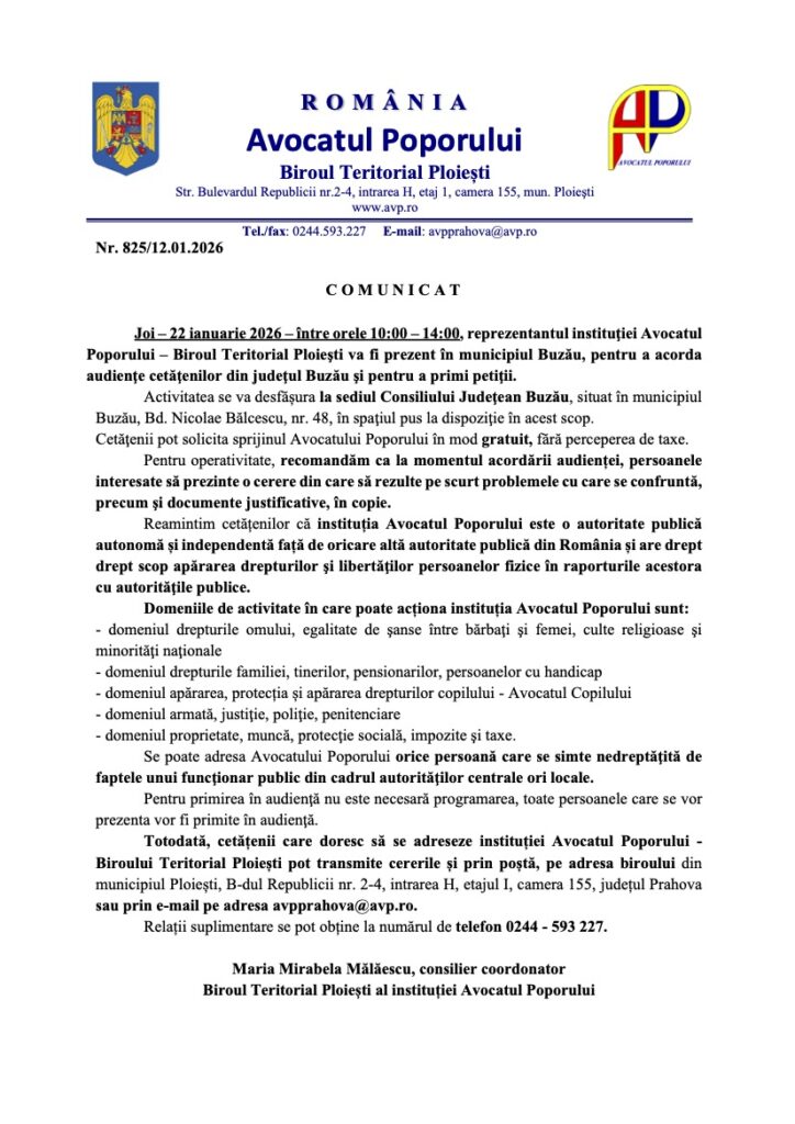 Comunicat – Audiente Avocatul Poporului in data de 22.01.2026
